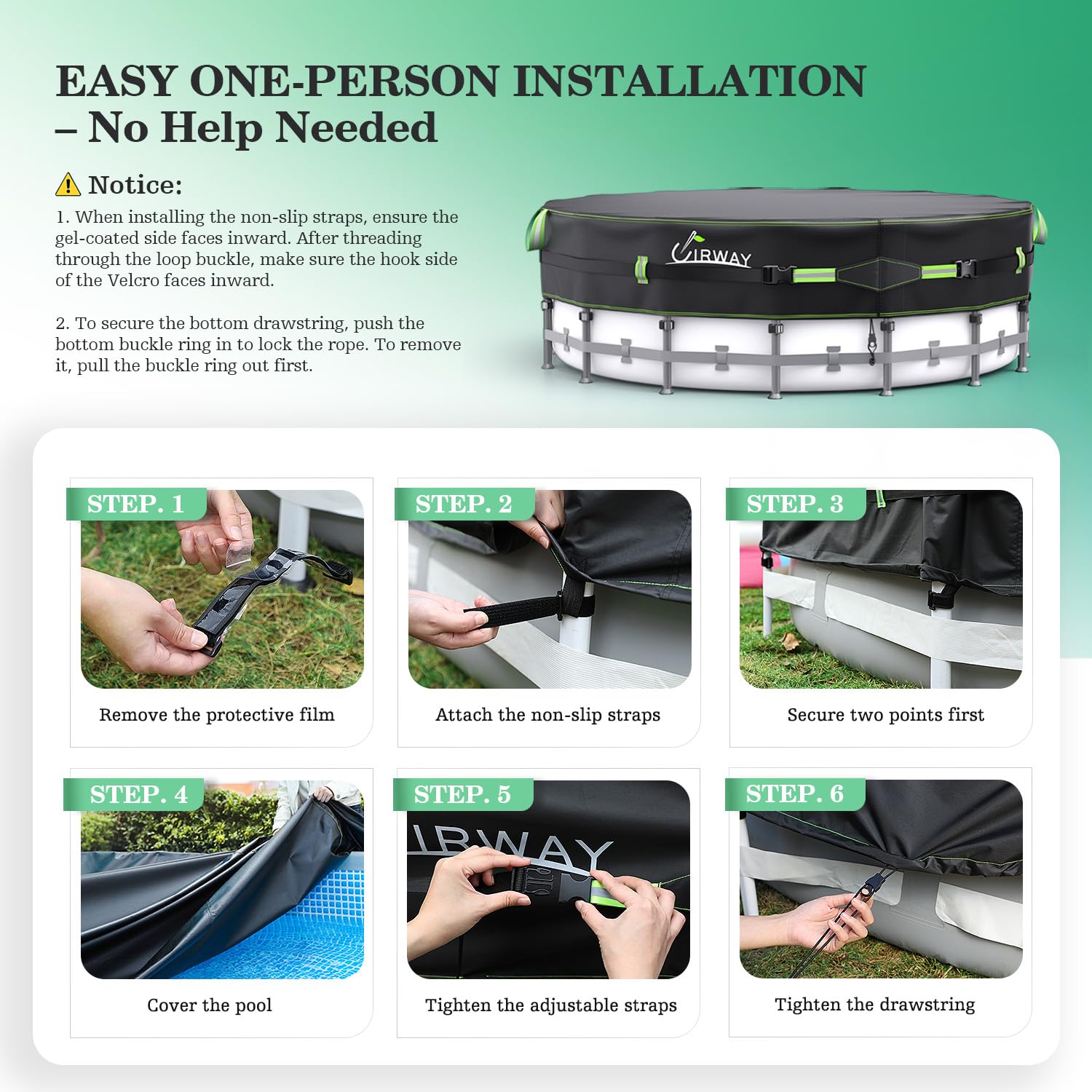• Included: Pool Cover, Steel Cable, Zinc-Alloy Winch, Installation Instructions